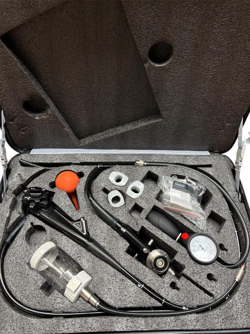 La torre incorpora además una bomba de aspiración marca Yuwell, esencial para mantener un campo visual limpio y seguro. El sistema se complementa con un videogastroscopio EW-200, un videocolonoscopio EW-600 y un videoduodenoscopio Minston, permitiendo realizar estudios completos del tracto digestivo superior e inferior.